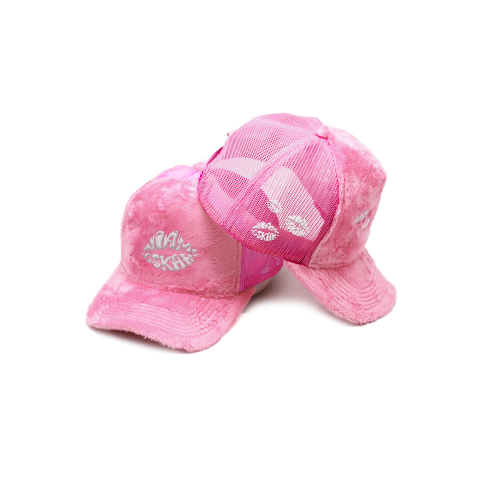 Růžová fluffy kšiltovka se síťkou, nastavitelnou velikostí a ohnutým kšiltem s motivem LOVERBOY